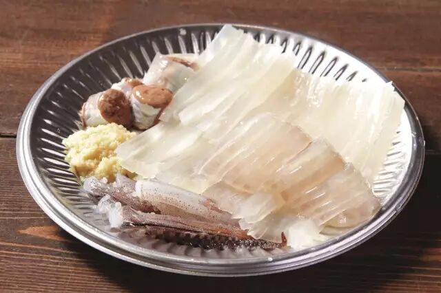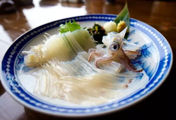 从水槽里挑了一条大个头的,拿给师傅。只见师傅三下五除二拔下乌贼头,瞬间涌出一团墨汁,重新清洗乌贼后,师傅将头部胡须处朝下轻放于桌面,那乌贼头还在左右张望似的挪动 着,引得我们一阵兴奋。而鱼身则被整齐地切成条状放入餐盘,最后将那还不安分的乌贼头也一同装盘。蘸上拌有姜末的酱油汁,富有弹性的乌贼肉嚼上既爽滑无比,又颇具弹性。乌贼头则可请师傅烤熟后食用。