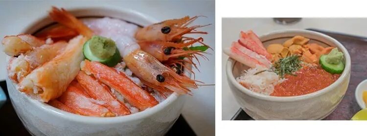 这里有函馆招牌的海鲜丼,由帝王蟹腿肉、甜虾和刺身组成,鲜美可口的生食搭配热腾腾的米饭,一吃便停不下来。