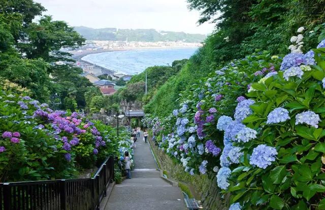 长谷寺是著名的花之寺庙,四季常有花竞相开放,最著名的要数6月的紫阳花。梅雨季节紫阳盛开,在寺内各处,特别是“眺望散策路”构成美丽的花道。见晴台前眺望海景,紫阳相伴,祈愿树下聆听观音之声,静心净心。