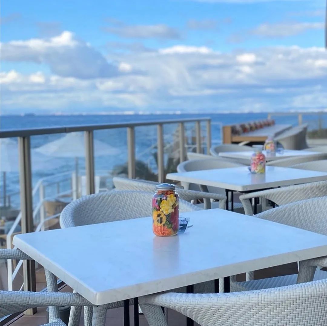 “船舱”周围的玻璃墙面提供浸入式的蔚蓝海景。置身其中,就像在海上享用下午茶,有种远离陆地的奇异感。