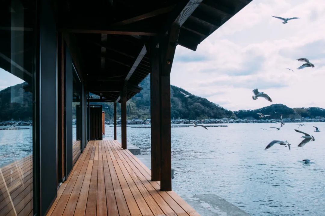 京都府的INE Café,位于丹后半岛北部伊根站附近的“舟屋日和”设施内。咖啡店由舟屋改造,漂在伊根湾像湖一样平静的海面。