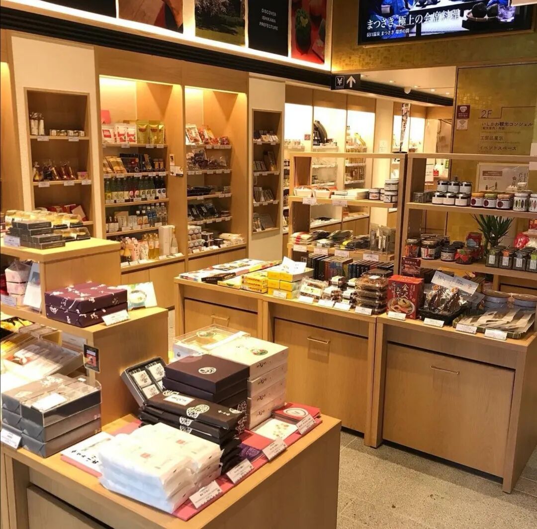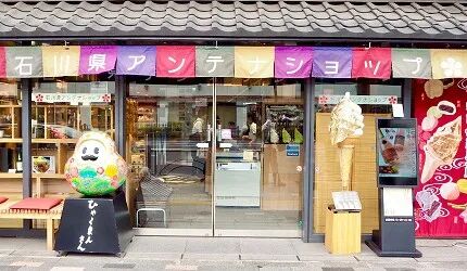 这家店一边卖甜品,一边专门贩售石川县特产,并作为地方观光展示与宣传中心。店面有达摩和石川县的传统文化装饰,十分具有地方特色。