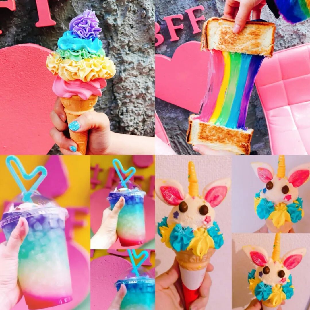 彩虹奶酪三明治看上去仿佛毒药般鲜艳,还有装在灯泡里的彩色饮料。而招牌冰激凌也是色彩饱和度很高的叠叠冰激凌,你们看这甜筒像不像颜色鲜艳的花火?