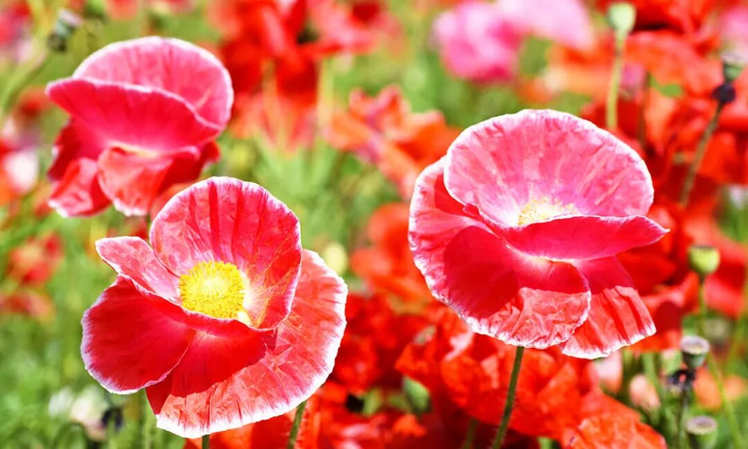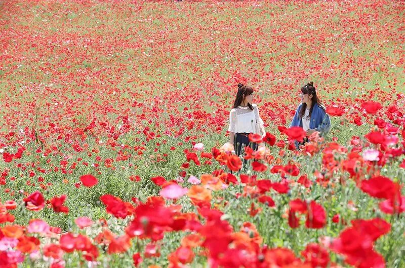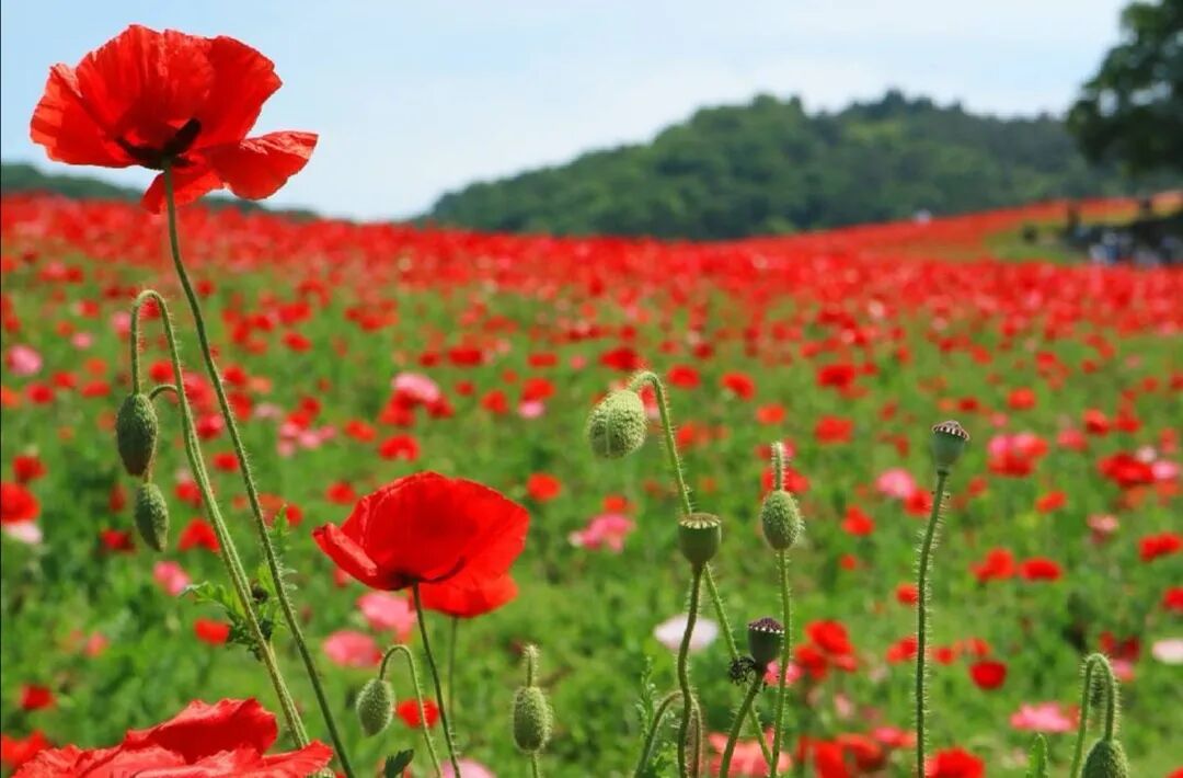 蔚蓝的天空、鲜红的虞美人、翠绿的群山形成鲜明的色彩反差对比,是此处独有的风景。