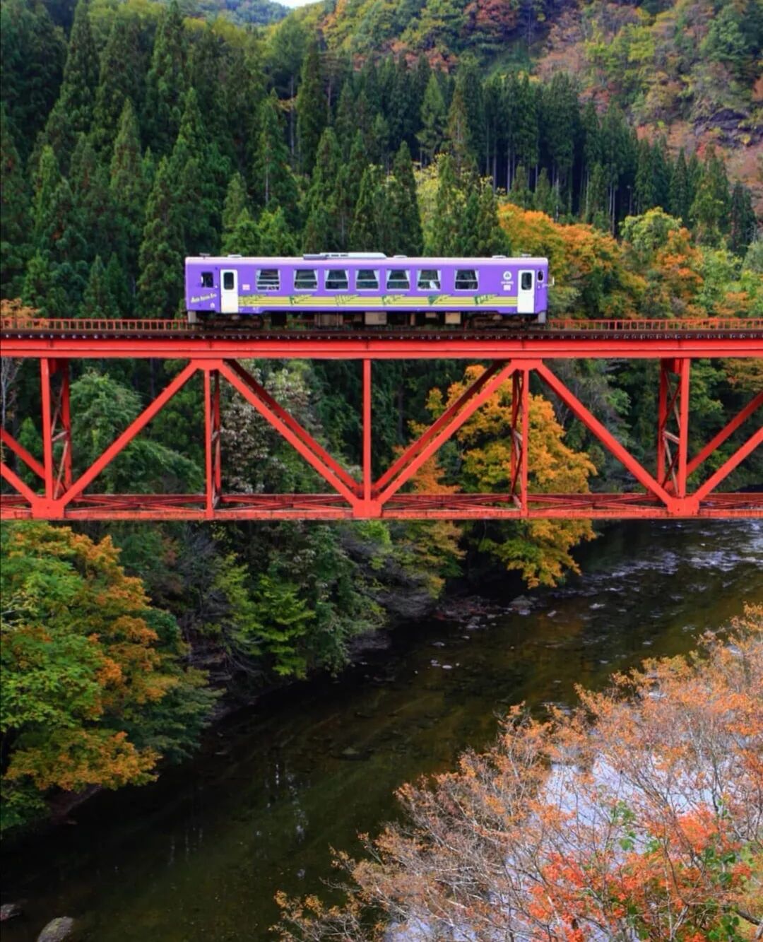除了温泉,另一种最佳赏秋方式是乘坐观光列车。铁道沿线红叶尽染,漫山遍野富有层次感的暖色调展现了秋田最惊艳的秋日风光。