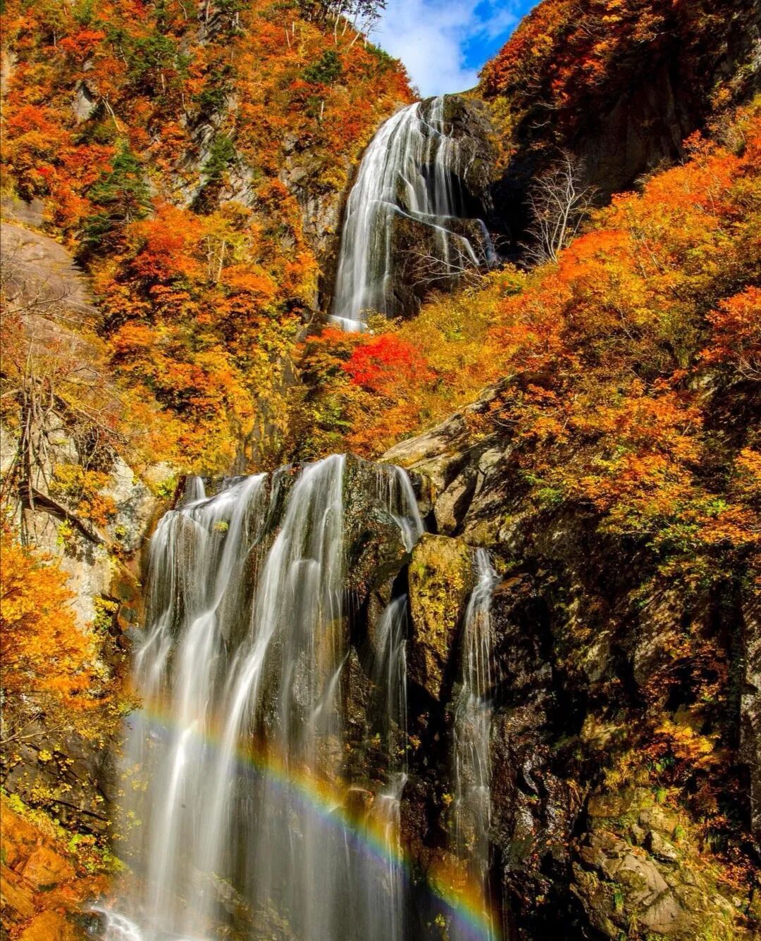 险峻的悬崖峭壁上悬挂着的白椅状的流水,与周围的红叶交相辉映,惊艳无比,被评为日本瀑布百选的第二名。