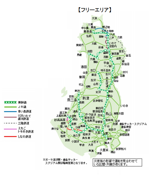 使用区域:东北、山形、秋田、上越、北陆新干线(东京-上越妙高间)、JR东日本线(含BRT)、青森铁道线、IGR银河铁道线、三陆铁道线、妙高高原-直江津间)、信浓铁道线。