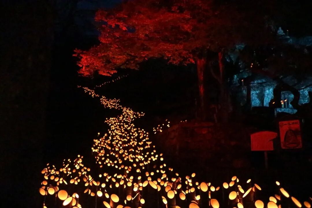这里一定不能错过的就是“十六罗汉”红叶竹灯,3000盏竹灯并排,仿佛会流动的竹光与周围的红叶交相辉映,非常迷人。