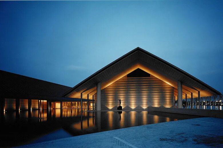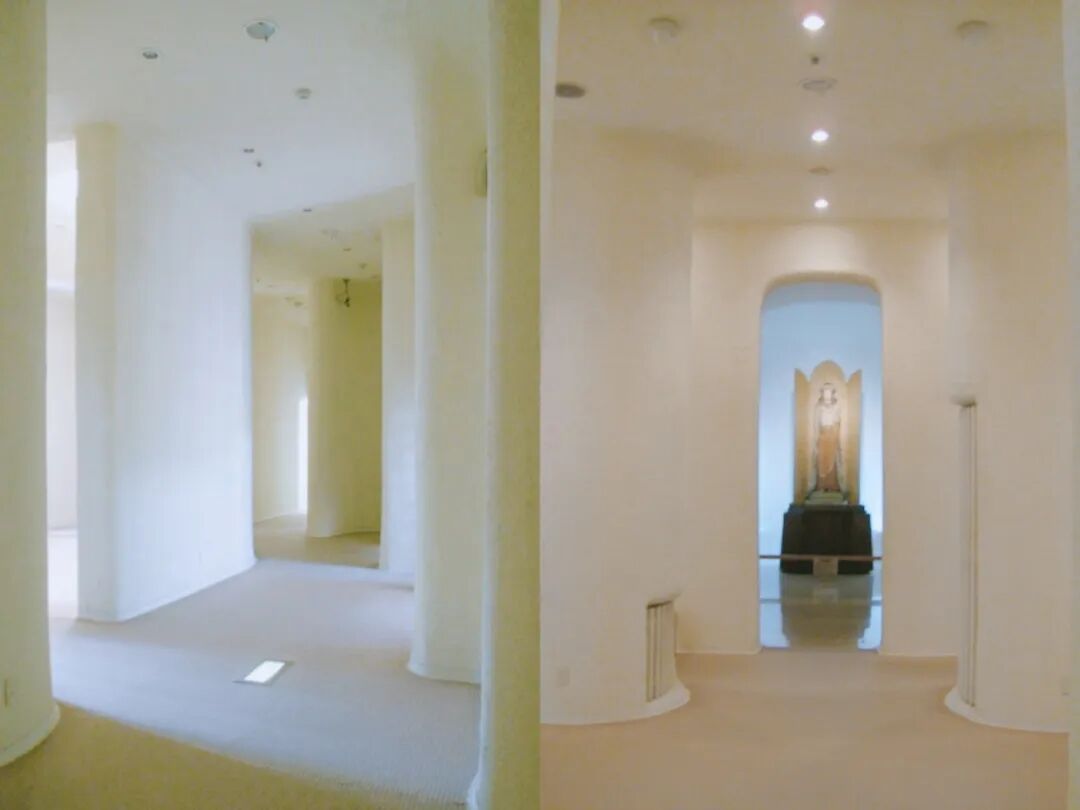 而美术馆本身以丝绸之路的沙漠苍凉感作为灵感,馆内设计为石窟式的空间,展示佛像雕刻作品。一个堂里安置了一尊佛像,观赏者要经过回廊到达下一尊佛像,就像是经过漫长的旅程与佛像相遇。