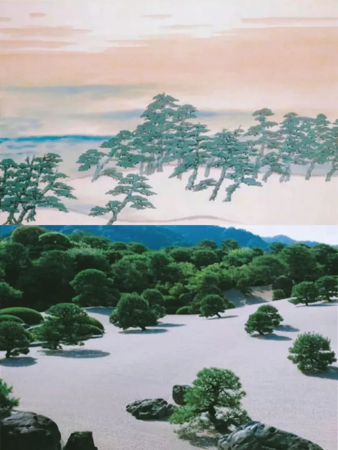 足立美术馆,它的庭园已经连续17年被世界权威的《日本园艺杂志》评为“最美日本庭园”。它的馆藏有日本画大师横山大观作品130幅之多,居日本之最。庭园中的白砂青松庭更是取景于横山大观的名作《白砂青松》。