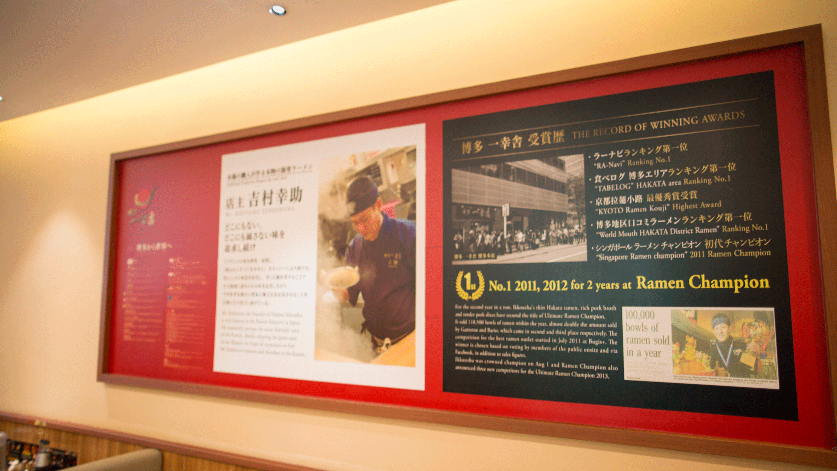 墙上也是挂满了博多拉面所获奖项,电视里也播放着博多拉面宣传片,总之就是要告诉你:“你没走错,这就是那家牛逼哄哄的正宗日本博多拉面!”