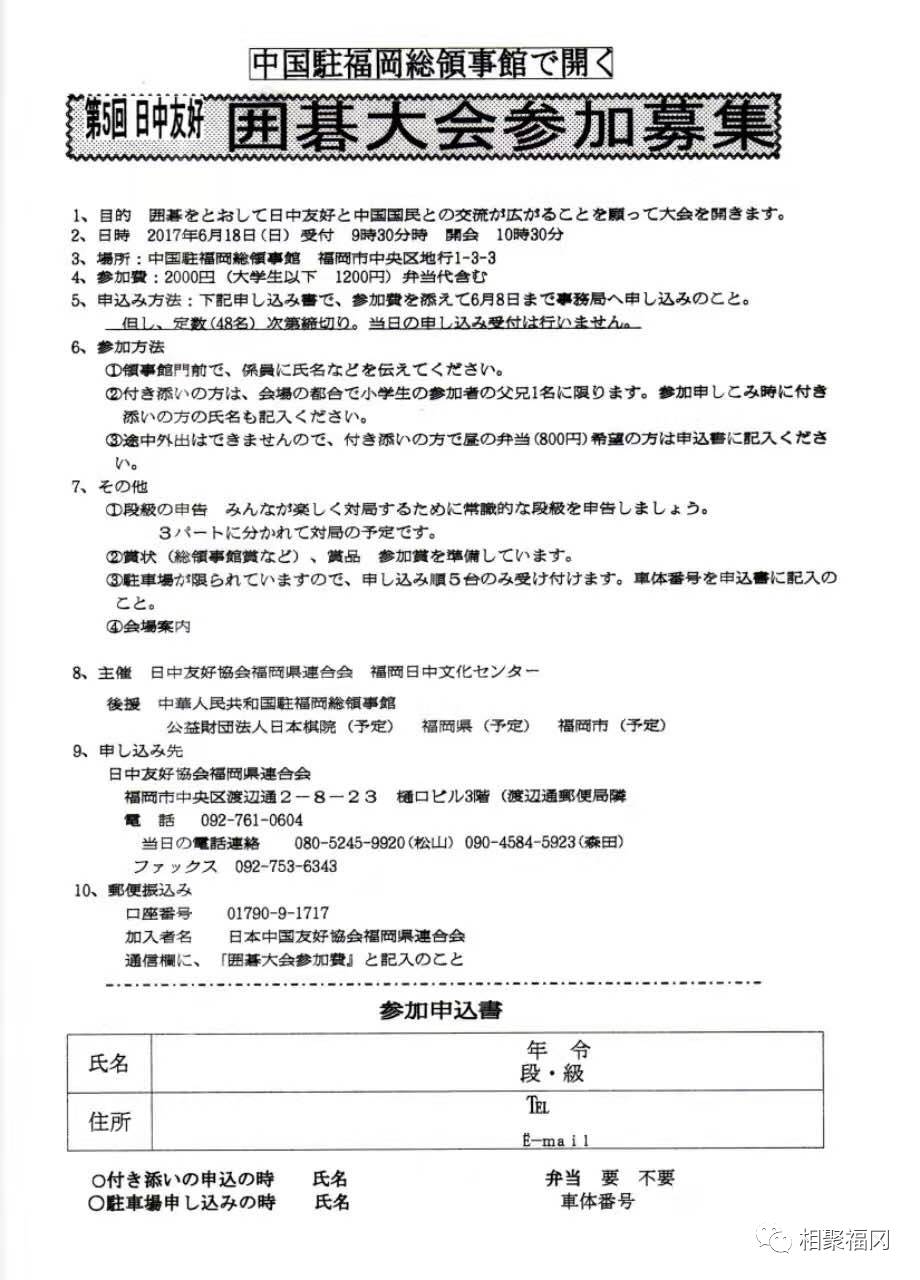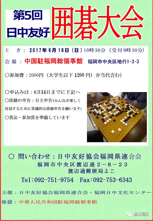 中日友好围棋大赛邀请你来参加! 本地服务, 活动 2017年6月12日 14.37W 0 下载喵日本APP获得更多日本相关信息,自由行定制微信janson-ren 由中日友好协会赴港联合会 举办的中日友好围棋比赛将于6月18日在驻福冈领事馆举行。欢迎大家报名参加。 如果喜欢围棋的朋友一定不要错过啊 热门推荐 ○本来还在打电话的日本人一上地铁,为什么突然就没声了…… ○POLA顶级黑BA套装2017年6月6日限量发售,超级划算赶紧行动! ○梅雨季日本最美的地方大盘点 更多精彩 都在APP里 请点击原文下载哦 【深度日本俱乐部】 赞(0) 赏 分享 本文由 相聚福冈 作者:janson 发表,转载请注明来源!