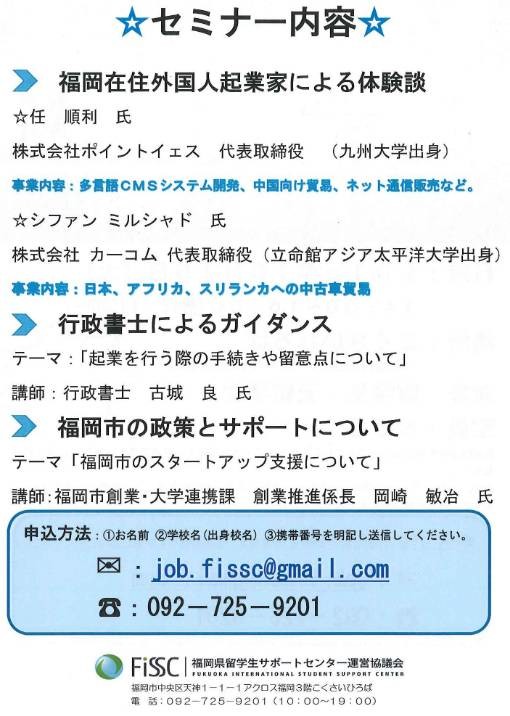 在福冈的各位同学们明天有一场专门为留学生创业准备的小型讲座。感兴趣的可以去听一下。
