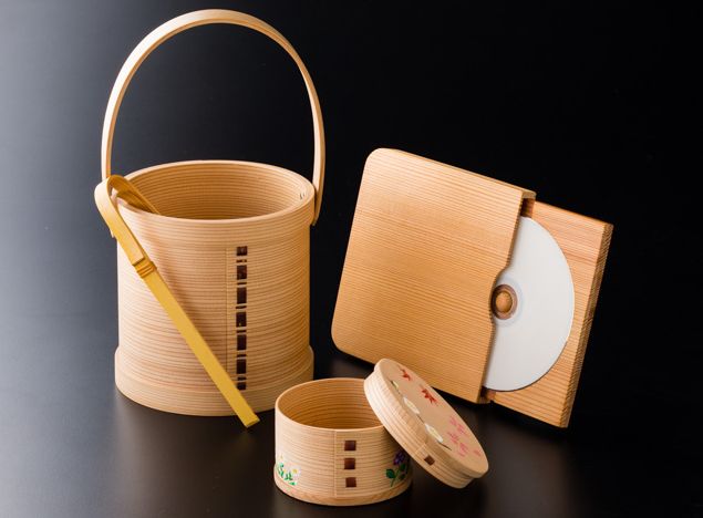 曲物是一种将杉树的直纹板弯曲后,以樱树皮加以缝缀,再安上底的容器。其代表作品是POPPO膳(食案)。不仅可用于放置饭桶和饭盒儿等日用品,还可以用作葡萄酒冰桶和光盘盒等.