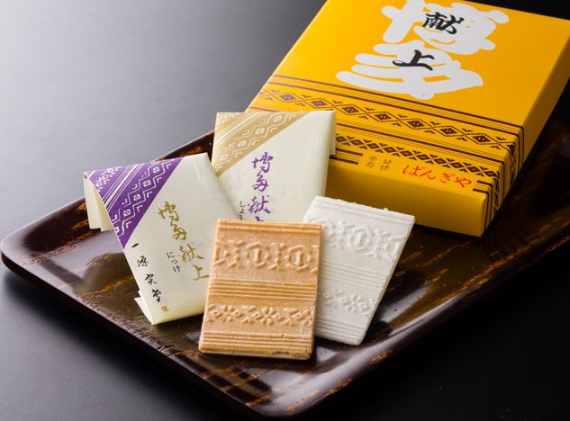 加入生姜,肉桂的软糖夹在带献上花样的维夫饼中制作而成的。最适合用于茶会上的干点心。花纹是根据博多织物设计创作的。看着就十分有年代感。