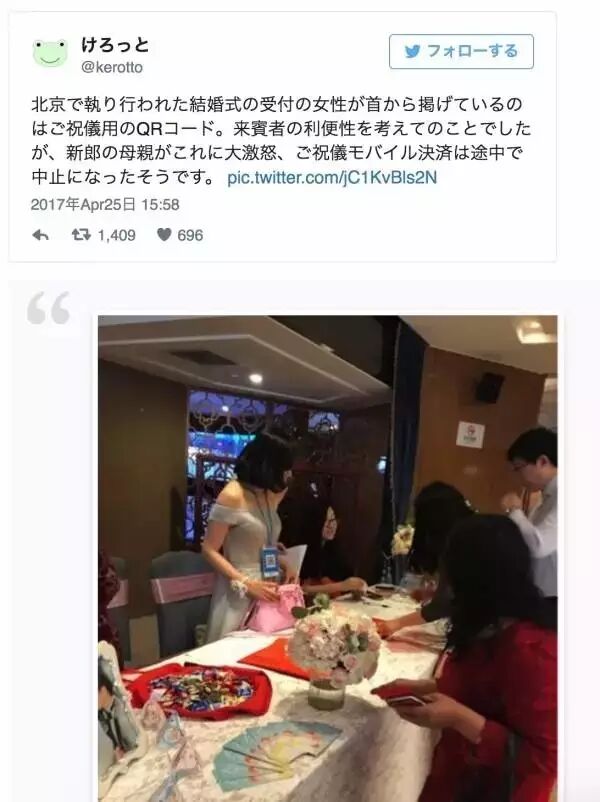 7、北京的婚礼上接待的女性脖子上挂的是收礼金的二维码!虽然是为了来客的方便,但是据说新郎的母亲勃然大怒,终止了这种方法!