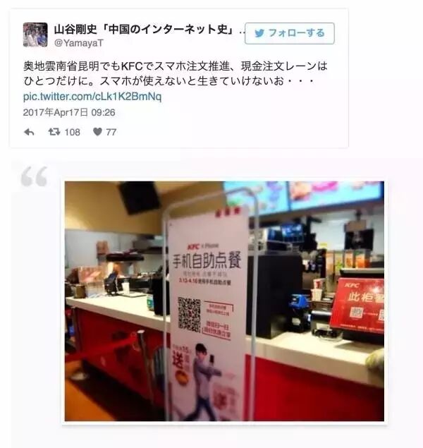 2、中国内陆的云南省昆明市的KFC也在推进手机点单,现金点单只有一列。不会用智能机活不下去啊...