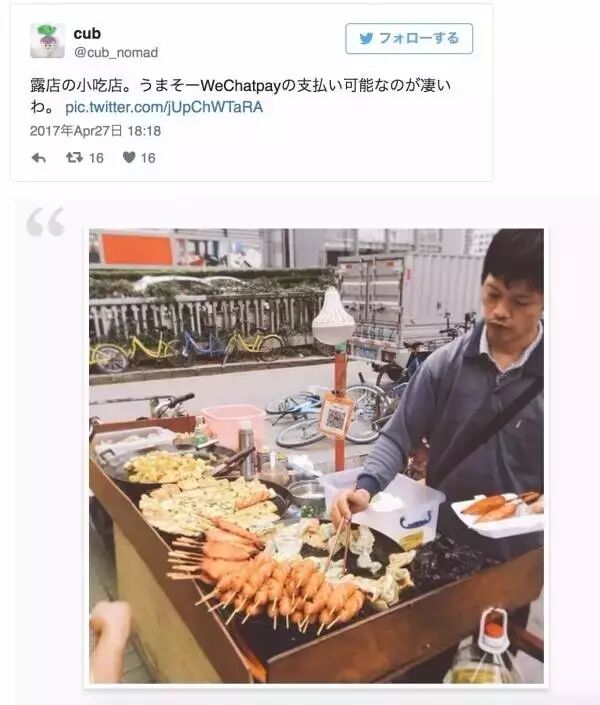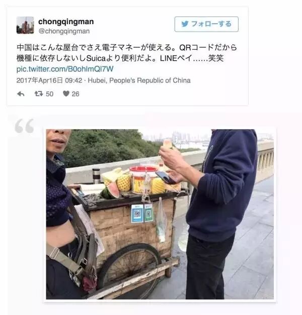 4、中国这种街边摊都可以用电子货币!用二维码可以不限机种,比Suica更方便,更不要提Line支付了...