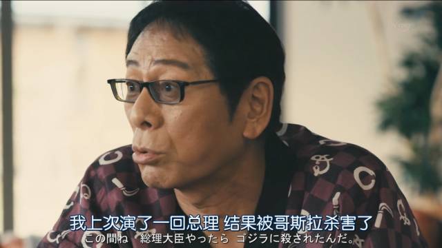 到了《Byplayer》里,大杉涟就狠狠吐槽道,好不容易演了个大人物,坐着飞机好端端的,就被哥斯拉给“误杀”了。