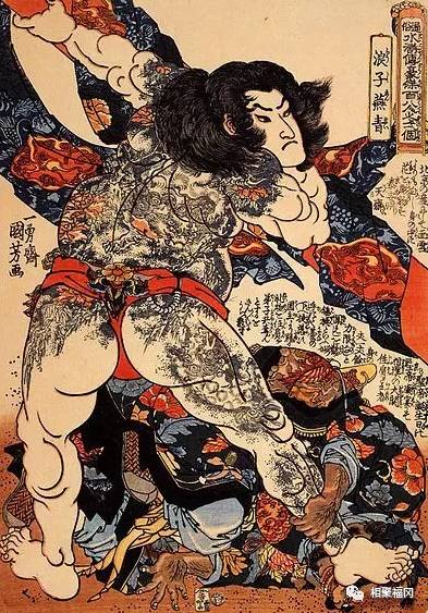 尤其是在画家葛饰北斋为泷泽马琴翻译的“水浒传”的英雄身上画了骇人勇猛的纹身使得日本人很为之着迷。