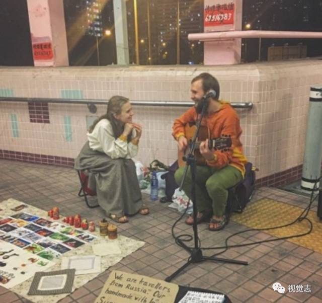 香港过街天桥上一对流浪的俄罗斯情侣,男人弹着吉他,女孩子托着下巴看着她心爱的男人,眼睛里都是糖。