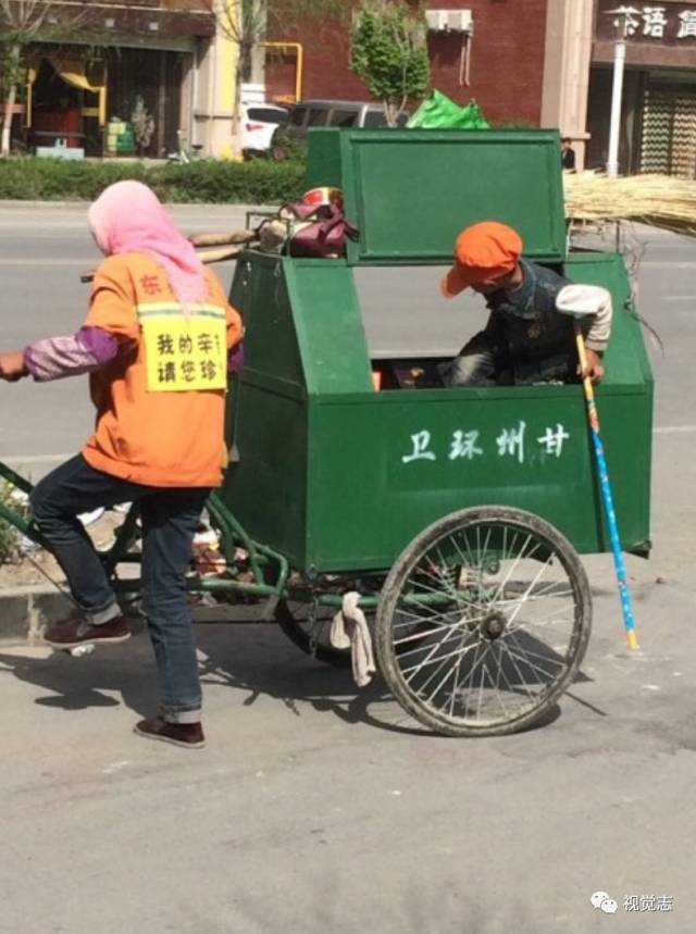 城市街头,一位环卫老奶奶,带着自己的小孙儿认真地清扫街道。