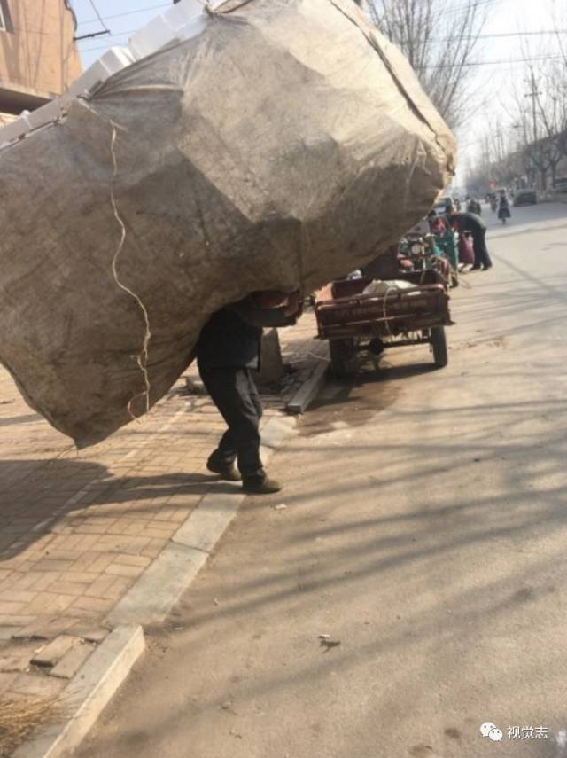 一位60岁的大伯,佝偻着背,背着50斤的泡沫箱一步一步艰难前行……