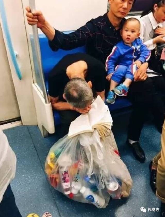 一位拾荒老爷爷,在回家地铁上认真地读着书本。