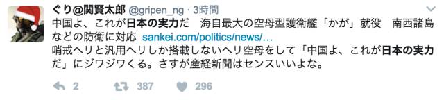 日本《产经新闻》报道时难掩兴奋之情:《中国啊,这就是日本的实力!海上自卫队最大的直升机护卫舰“加贺”号正式服役》