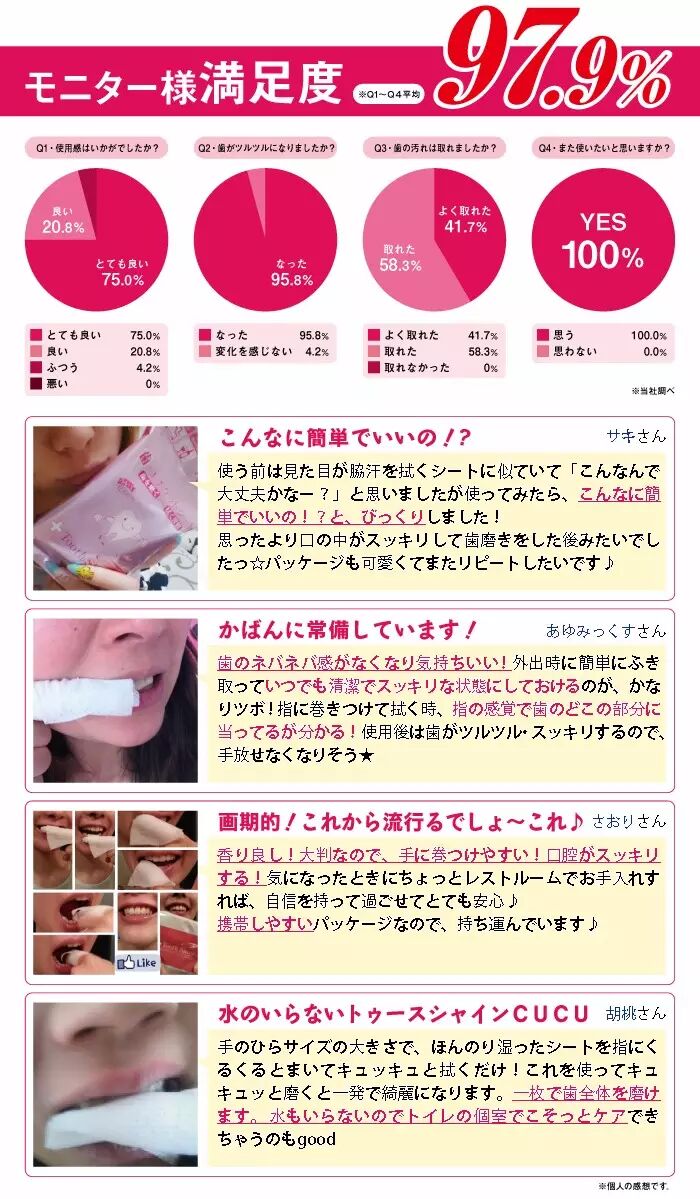 日本顾客满意程度高达97.9%!!使用方便简单,用餐后使用一张,去除口内的细菌和残留牙渍,不用水,不用牙膏,省去了刷牙的繁琐,却效果远超刷牙哦。