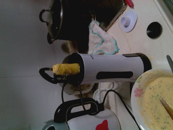 这货的外形很像一只飞机杯。它的使用方法是:先将搅拌后的鸡蛋倒入机器顶部一个屁眼大的小洞里,然后按下开关,做好后,一根散着热气的蛋卷会从小洞中突突突地冒出来。