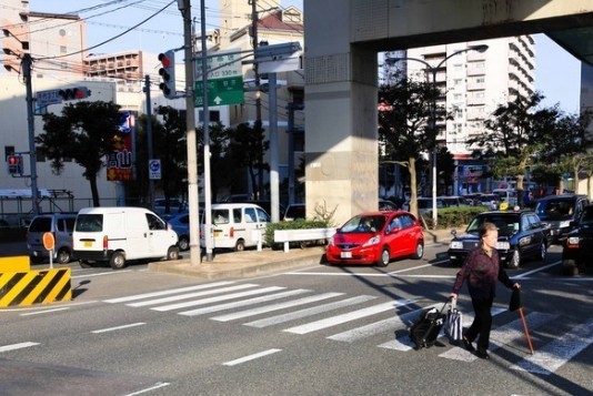 老太太走路慢,红灯亮起时,没有走到马路对面。车辆还是静静的等待,没有鸣笛催促,远处的红色小车没有起步先行。