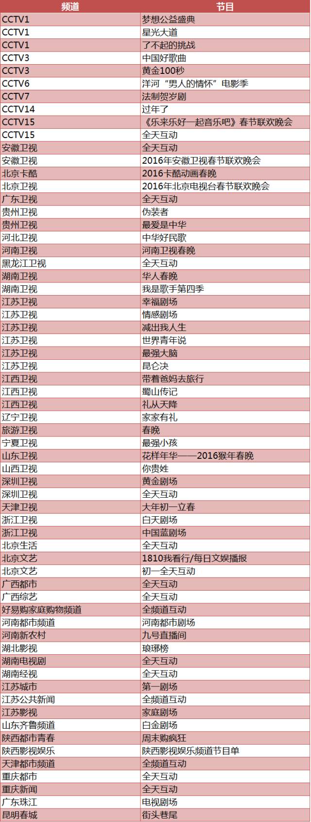春节期间,63个电视节目可通过【微信】-【发现】-【摇一摇】-【电视】,对着以下正在播出的电视节目摇动手机,摇出微信红包。