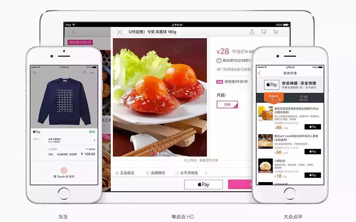 除了线下支付,Apple Pay 还可以用于线上支付。在中国,Apple Pay 可以用于 Apple Store、大众点评、当当网以及易道用车等应用内产生的付款。这部分功能除了可以在 iPhone 上实现之外,也可以在 iPad 上实现。Wallet 可以通过 iCloud 进行云端同步,也就是说,只要在 iPhone 设定好信用卡,iPad 也会自动同步你 iPhone 银行卡信息。