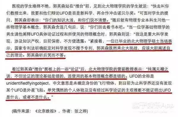 报道称,在学生的提问下郭英森的回答含糊不清,大学物理教授看过后表达:纯属无稽之谈。
