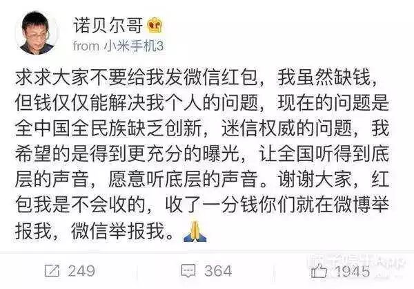 因为没有任何回音和支持,有人说他走火入魔胡言乱语,他有很长时间没有发博。直到2016年他的视频再次被翻出,诺贝尔哥再次走进人们的视线。