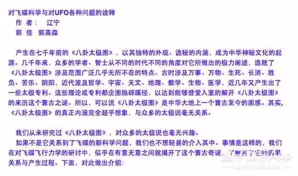 他在文章中揭秘了古代太极八卦的力学形成缘由,并推断出UFO新科学