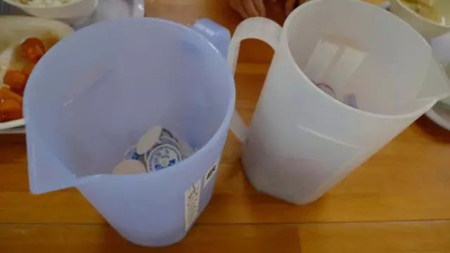 她立刻将绳子和封盖分成两个杯装起来,还拿着杯向旁边的中国学生走去,帮助他们分开装。
