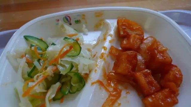 看看日本小朋友吃饭的样子,很努力的吃,汤已经一滴不剩了,菜也快吃完了。