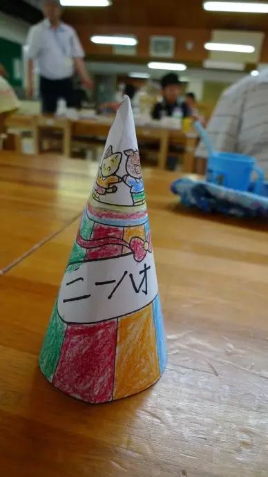 这是日本学生为我们准备的礼物,是他们画的画,做成小帽子放在桌子上。