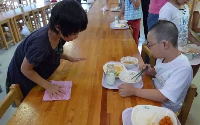 几乎所有的同学都吃完了,下面的场面,就是终生难忘的了。很多日本孩子开始自觉的擦桌子,干活了。