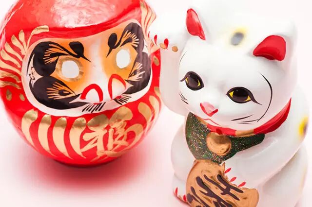 提起日本的幸运物,就不能不提到“招财猫”。“招财猫”也是一种人们熟悉的幸运物。人们认为用陶器等制作的招财猫是生意兴隆的幸运物,经常能在餐饮店等场所看到。此外,还有一种叫做“达摩不倒翁”的幸运物,其形象模仿了佛教流派禅宗的先祖。红色纸糊的脸孔看起来很威严,深受人们喜爱,主要出产于群马县高崎市等日本东北到关东地区。