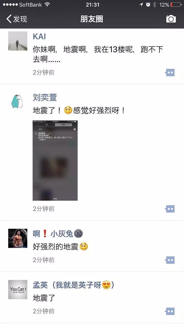 接下来再看朋友圈,被这个画面刷屏了。说明几乎在同一时刻地震中心周围的人都受到了地震预告信息。更有朋友说在电车里,一车的人的手机都在响。