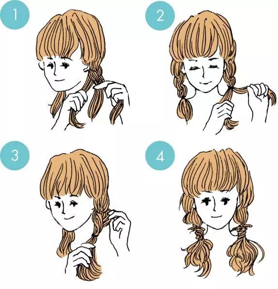 ❀将头发平均分成两束,然后辫成小辫子,然后发尾盘成发髻,这时候要注意发髻不要盘的太高了~