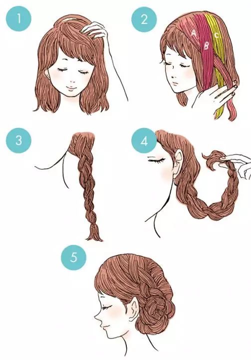 ❀头发向一侧梳成小歪辫子,鬓角的地方要留出来两束细细的头发才更可爱!再把发顶揪的蓬松一点。在看日剧的时候,你一定看见过这个发型~