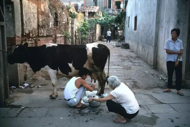 1983年,福建,泉州。奶牛的主人牵着奶牛到要买牛奶的人家门前,然后现场挤牛奶,真是绝对新鲜的牛奶呀!