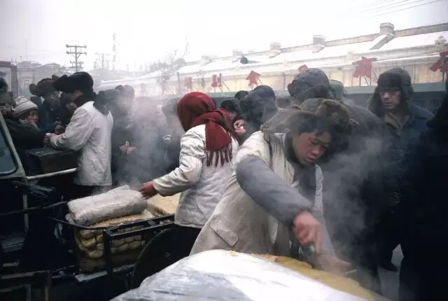 1981年,黑龙江,哈尔滨。市场上到处都是卖年糕的商贩,这种热气腾腾的“面包”很畅销。旁边卖烤红薯的生意也很好。