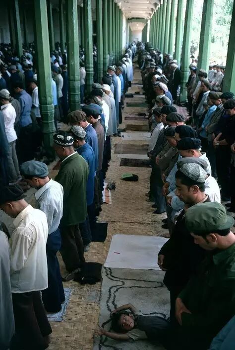 1981年,新疆,喀什。在喀什老城中心的伊斯兰清真寺中,一个男孩躺在地上,等待他父亲祷告结束。