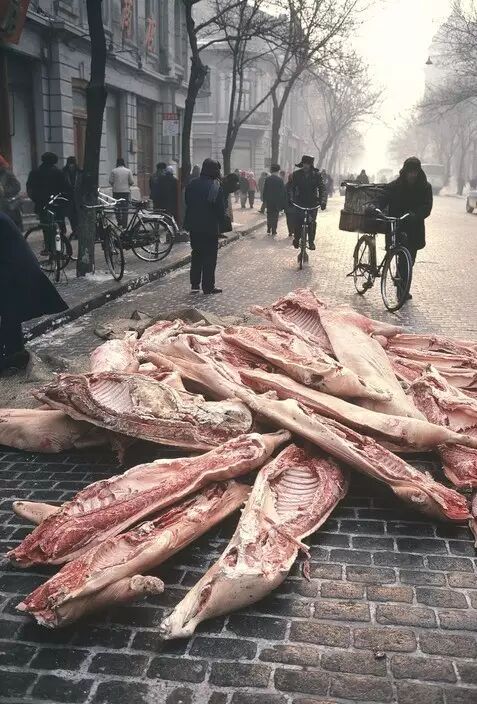 1981年,黑龙江,哈尔滨。冬季气温下降到零下35度,每天早上一名拉猪肉卡车司机把猪肉像木材一样堆在猪肉店门口的街上。
