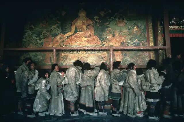 1981年,西藏,拉萨。新年那天的黎明,成千上万的藏族牧民到大昭寺参观祈祷。他们穿着厚厚的羊皮外衣,耐心等待了几个小时后才挤进大厅。